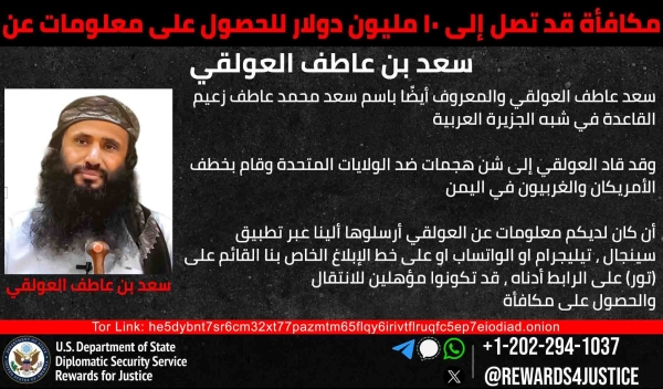 الولايات المتحدة ترفع مكافأة القبض على زعيم القاعدة في اليمن إلى 10 ملايين دولار وقال البرنامج: "لقد قمنا بزيادة المكافأة المعروضة للحصول على معلومات حول هذا القائد الإرهابي، ساعدونا في العثور عليه".