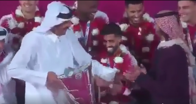 شاهد بالفيديو : أمير قطر يُهين كابتن المنتخب ويرفض التصوير معه ويسحب الكأس من يده شاهد بالفيديو : أمير قطر يُهين كابتن المنتخب ويرفض التصوير معه ويسحب الكأس من يده