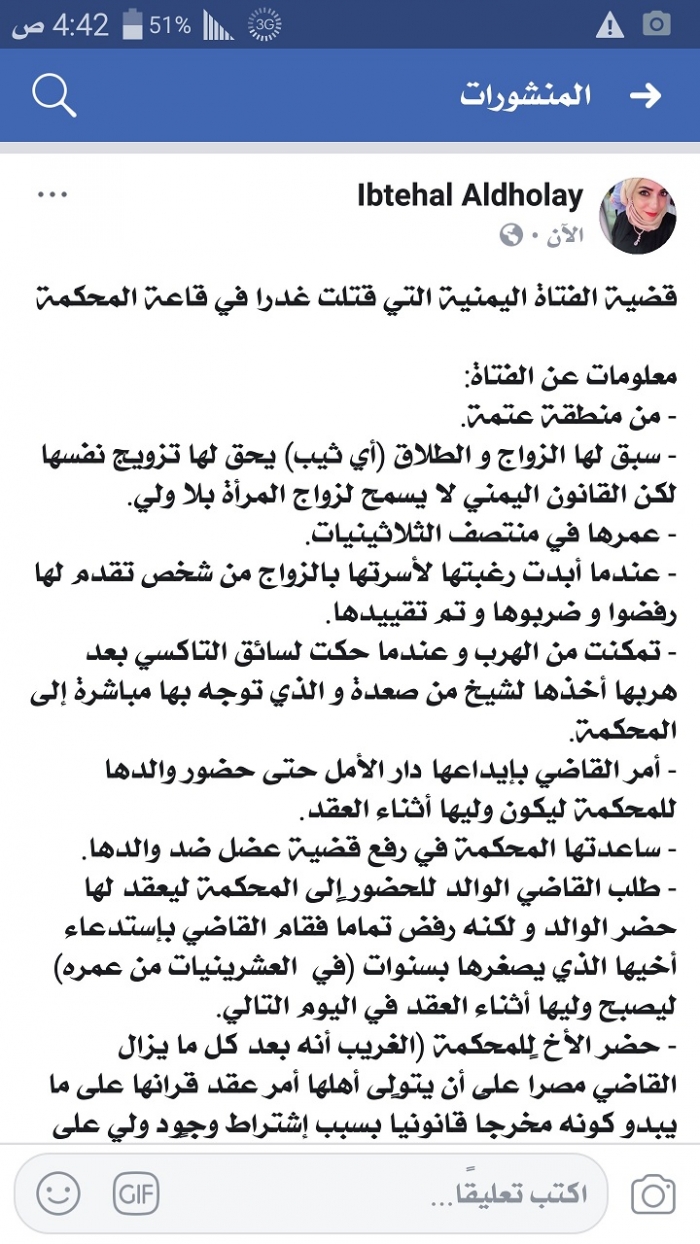 قضية الفتاة اليمنية التي قتلت غدراً في قاعة المحكمة معلومات عن الفتاة: - من منطقة عتمة.