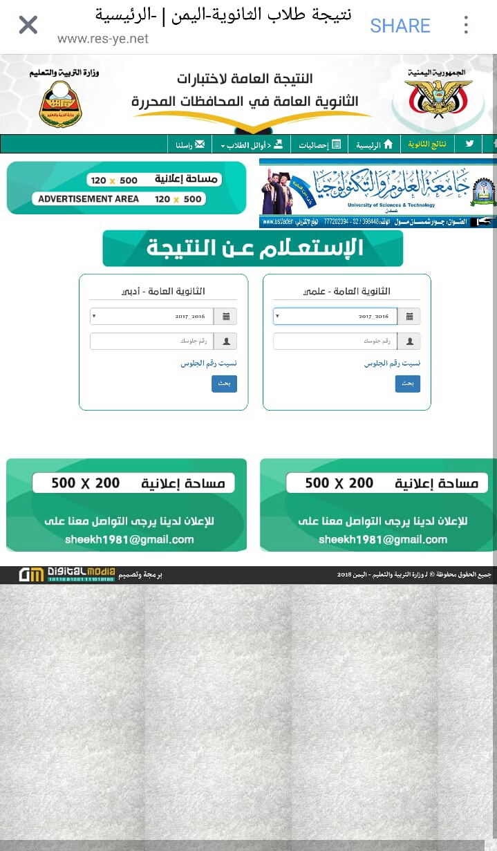 وأضاف في تصريح صحفي بأن باستطاعة الطلاب معرفة نتائج الثانوية العامة للعام الدراسي 2017 – 2018 عبر موقع النتائج res-ye.net التابع لوزارة التربية والتعليم وذلك عبر ادخال رقم الجلوس.