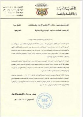 ”الاوقاف” اليمنية توجه تعميما هاما لخطباء كافة المساجد (وثيقة)