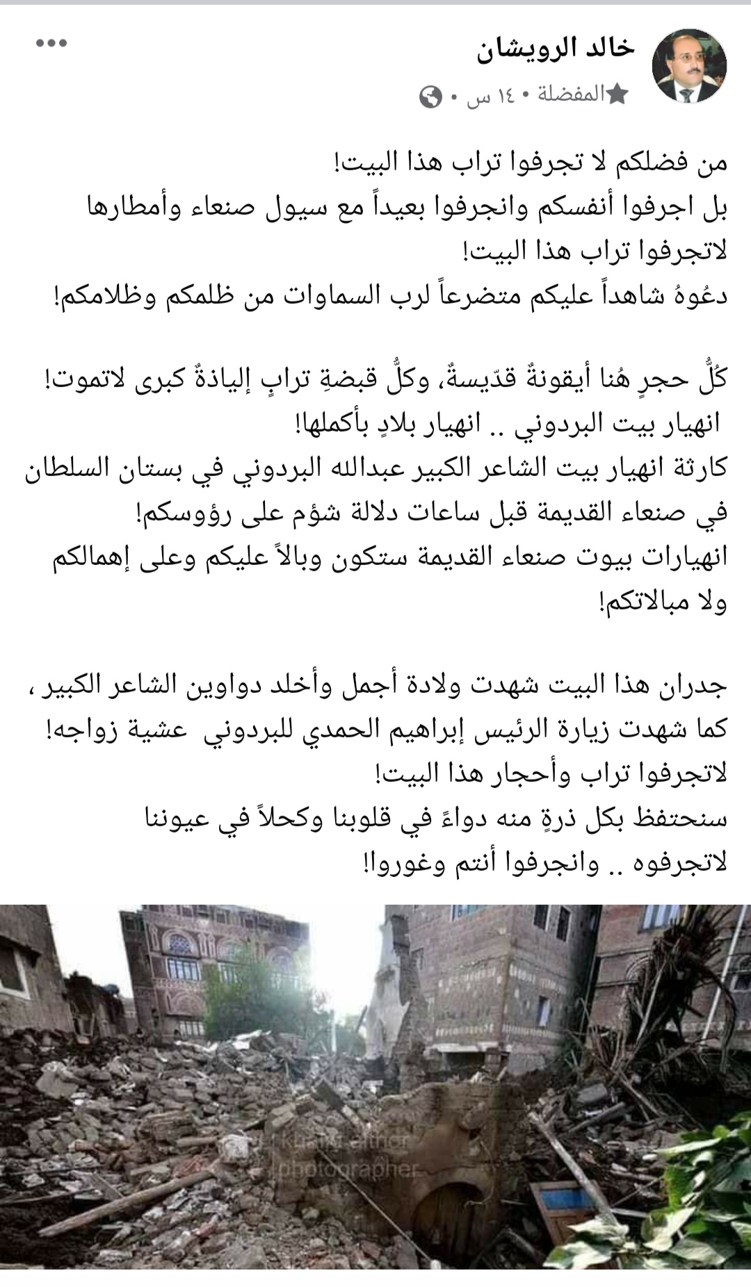 وجه وزير الثقافة الأسبق خالد الرويشان رسالة قوية ومؤثرة لسلطات الأمر الواقع في العاصمة صنعاء جراء الكوارث التي تشهدها المحافظة بسبب الفيضانات والتي تسببت مؤخرا بتهدم منزل شاعر اليمن الكبير عبد الله البردوني .