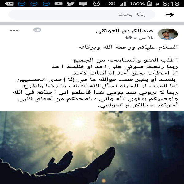 فيما كتب السجين عبدالكريم العولقي ، قبل ساعات من إعدامه السلام عليكم ورحمة الله وبركاته.. أطلب العفو والمسامحة من الجميع ، ربما رفعت صوتي على أحد أو ظلمت أحد، أو أخطأت بحق أحد أو أسأت لأحد بقصد أو بغير قصد فوالله ما هي إلا إحدى الحسنيين، اما الموت أو الحياة نسأل الله الثبات والرضا والفرج.. ربما لا تروني بعد يومي هذا فاعلمو اني احبكم في الله و أوصيكم بتقوى الله و اني سامحتكم من أعماق قلبي.