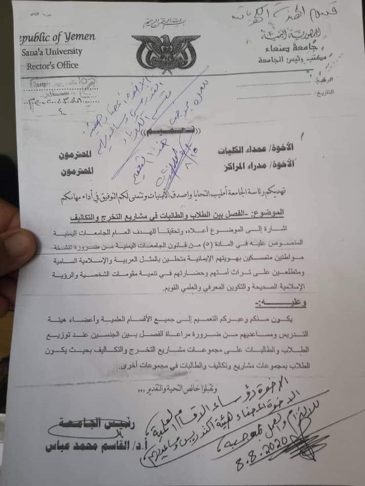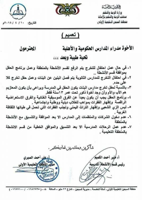 نشرت الناشطة البارزة "حنان الوادعي" تغريدة مرفقة بعدد من التوجيهات والتعميمات الصادرة عن سلطة الأمر الواقع بصنعاء التي تسيطر عليها جماعة الحوثي مشيرة الى أن الأخيرة تسعي الى تطبيق نموذج حكم طالبان الافغانية المتشدد والمتطرف في صنعاء والمحافظات الأخرى الخاضعة لسيطرة الميلشيا . واستشهدت الناشطة " الوادعي " بتغريدة نشرتها في وقت سابق الصحفية البارزة " ميساء شجاع الدين "حول مساعي الحوثيين " لطلبنة " العاصمة صنعاء .
