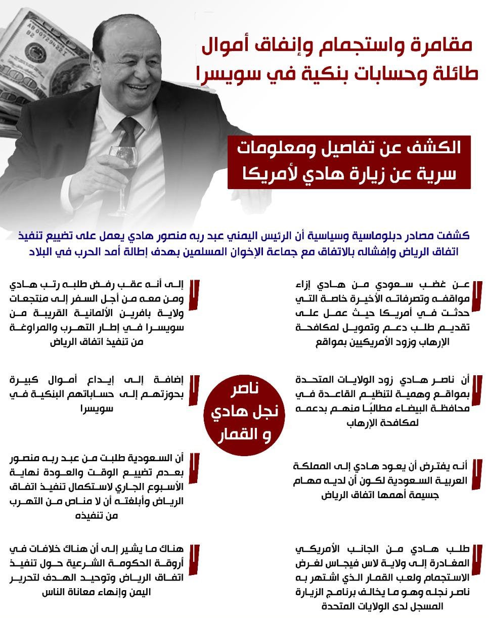 وأشارت المصادر إلى أنه عقب رفض طلبه رتب هادي ومن معه، من أجل السفر إلى منتجعات ولاية بافرين الألمانية، القريبة من سويسرا، في إطار التهرب والمراوغة من تنفيذ اتفاق الرياض، إضافة إلى إيداع أموال كبيرة بحوزتهم إلى حساباتهم البنكية في سويسرا، وفقًا لذات المصادر.