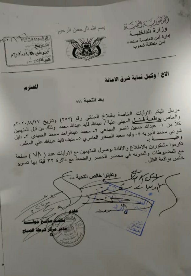 شاهد.. وثائق تكشف اجراءات إحالة قتلة الشاب عبدالله الاغبري إلى نيابة شرق أمانة العاصمة صنعاء ( وثيقة )