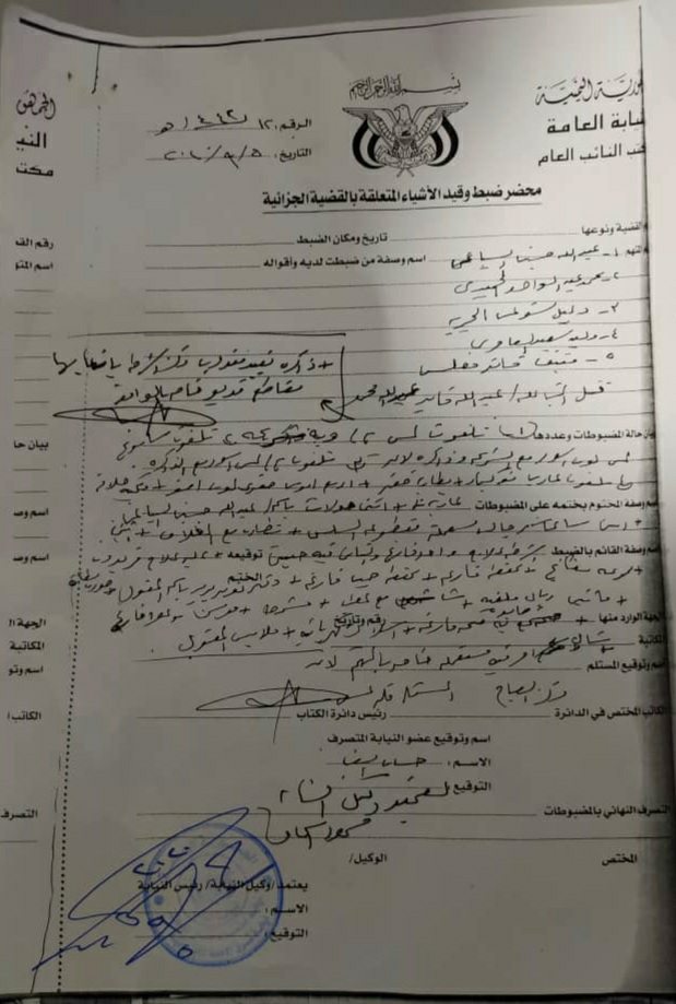 وأظهرت الوثيقة المرفوعة من إدارة امن العاصمة صنعاء وامن مديرية شعوب بوزارة داخلية الحوثيين في حكومة صنعاء إلى وكيل نيابة شرق الأمانة معنونة كالتالي :
