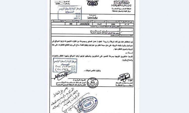 وتشكو برقية موجهة من القائم باعمال قائد المنطقة العسكرية السادسة اللواء الركن أمين الوائلي، إلى وزير الدفاع ورئيس هيئة الأركان، تشكو من قيام العقيد عمار الصغير بالانسحاب مع المقاتلين التابعين له بالانسحاب من موقع حويشبان والفرار باتّجاه منطقة الرويك على متن سبعة أطقم مع عياراتها و200 قطعة سلاح.