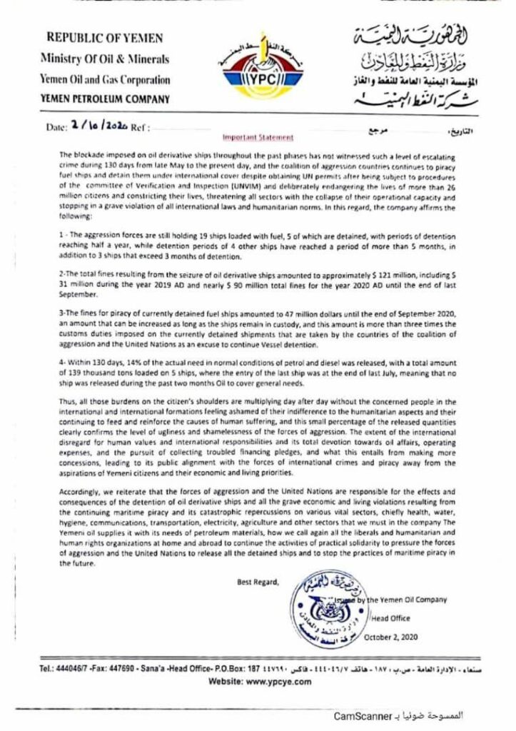 وأضاف البيان ” مازالت دول تحالف مستمرة في القرصنة على سفن الوقود واحتجازها بغطاء اممي رغم حصولها على التصاريح الاممية بعد خضوعها لإجراءات لجنه التحقق والتفتيش (UNVIM).