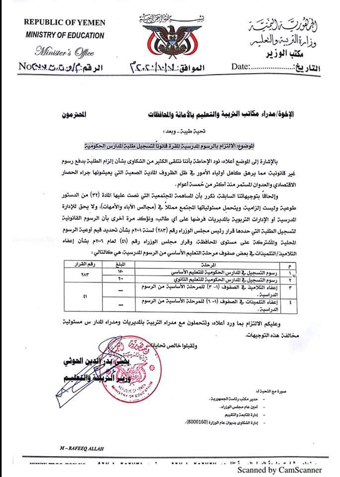 وقضى القرار في التعميم الذي أصدره وزير التربية والتعليم الاستاذ يحيى الحوثي، إلى مدراء مكاتب الوزارة بأمانة العاصمة والمحافظات، تحديد رسوم تسجيل طلاب المرحلة الأساسية بـ 150 ريال ومبلغ 200 ريال رسوم تسجيل طلاب المرحلة الثانوية.