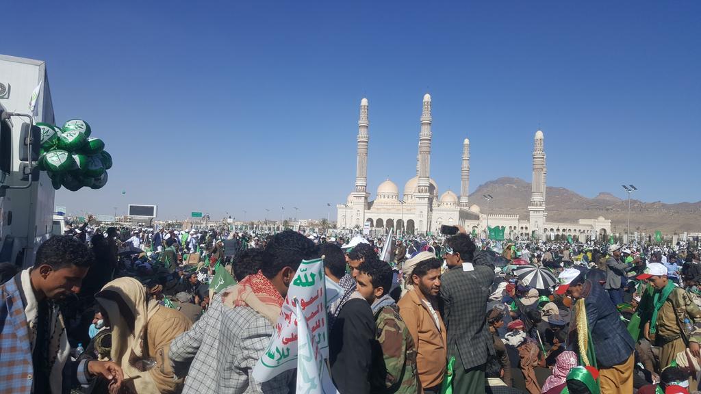 ولا تزال الحشود تتوافد على ميدان السبعين للمشاركة في إحياء ذكرى مولد الرسول وهو ما دعت إليه جماعة الحوثي .