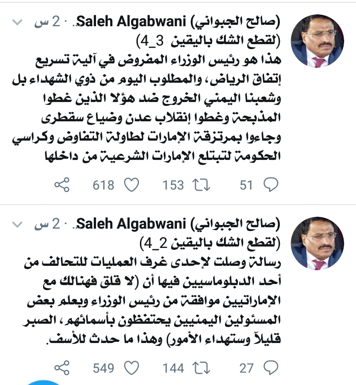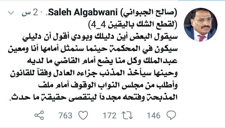 وأشار الجبواني في سياق تغريداته انه مستعد لتقديم الأدلة على صحة كلامة امام المحكمة حينما حينما امثل أمامها مع رئيس الوزراء معين عبدالملك ليقدم كلا منهم للقاضي ما لديه حتى يأخذ المذنب جزاءه العادل وفقآ للقانون.