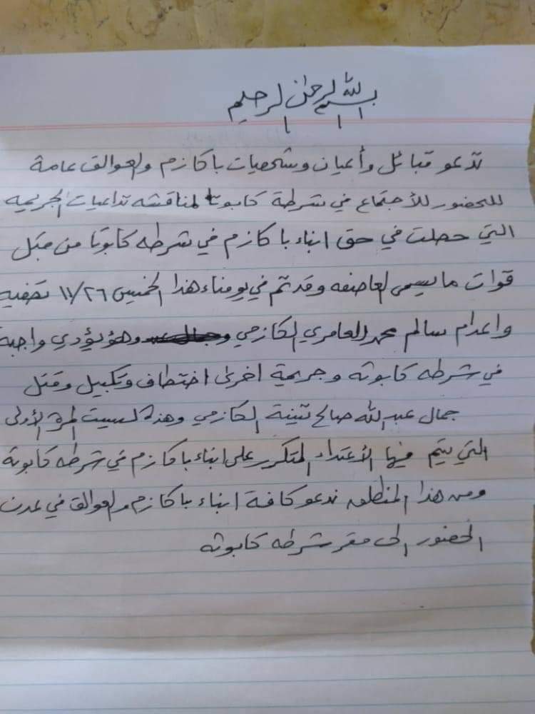 من جانبها دعت قبائل باكازم شخصيات وإعيان ومشائخ وابناء العوالق عامة لحضور اجتماع على خلفية تصفية اثنين من أبناءها هما سالم محمد الكازمي وجمال عبدالله تينة.