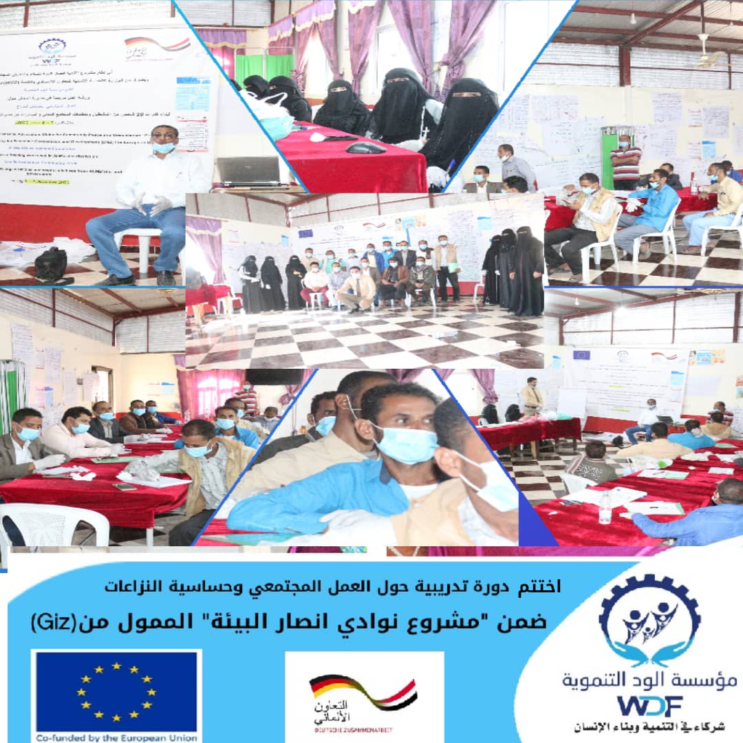 اختتمت مؤسسة الود التنموية الدورة التدريبية حول العمل المجتمي وحساسية النزاع بمشاركة 20 مشاركاً من النشطاء المتجمعين من منظمات المجتمع المدني والقيادات الشبابية من مديريتي المعافر وجبل حبشي والتي استمرت من 5-9 ديسمبر 2020