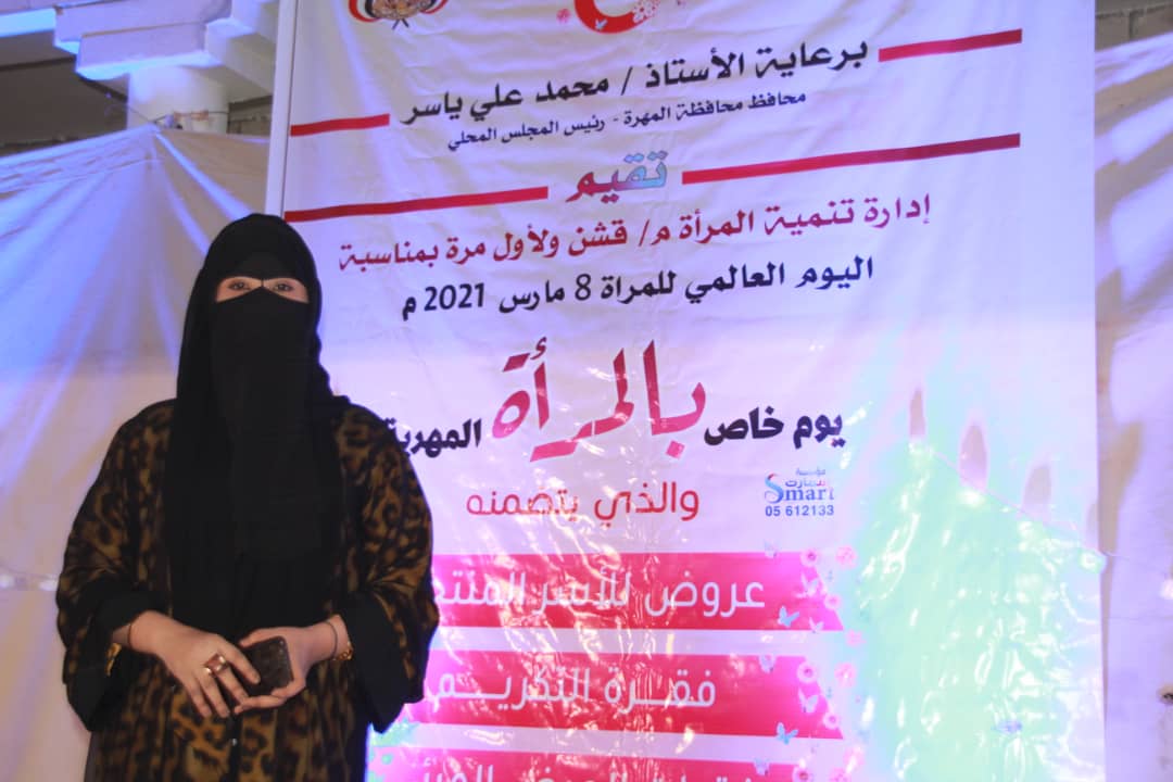 الشيخة أشواق مبارك بن عوشن مديرة ادارة تنمية المراة بمديرية قشن بمحافظة المهرة عبرت عن سعادتها بنجاح اقامة الحفل الأول احتفاء بيوم المرأة العالمي و مشاركة العالم بهذا اليوم بطريقتنا موضحة أن معرض الاسر المنتجة تشارك فيه (25)اسرة منتجة