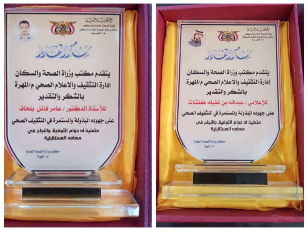 كرم مكتب الصحة والسكان بمحافظة المهرة و ادارة التثقيف والاعلام الصحي اليوم الخميس كلا من أ. د. عامر فائل بلحاف و الناشط الاعلامي عبد الله بن غفيلة كلشات.