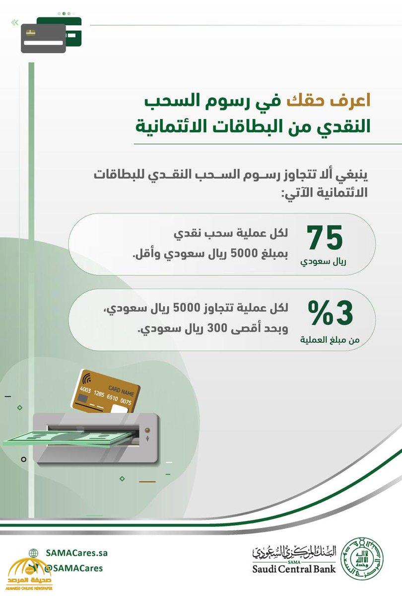 وقال “ساما” أنه ينبغي ألا تتجاوز رسوم السحب النقدي للبطاقات الائتمانية 75 ريالا لكل عملية سحب نقدي بمبلغ 5 آلاف ريال سعودي وأقل.