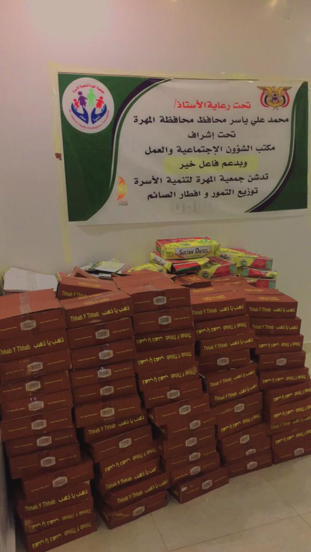 دشنت جمعية المهره لتنمية الاسره ، اليوم الاثنين بمدينة الغيضه عاصمة محافظة المهرة توزيع (300) كرتون تمر ضمن مشروع إفطار صائم واستهدفت النزلاء في مستشفى الغيضه المركزي و السجون.