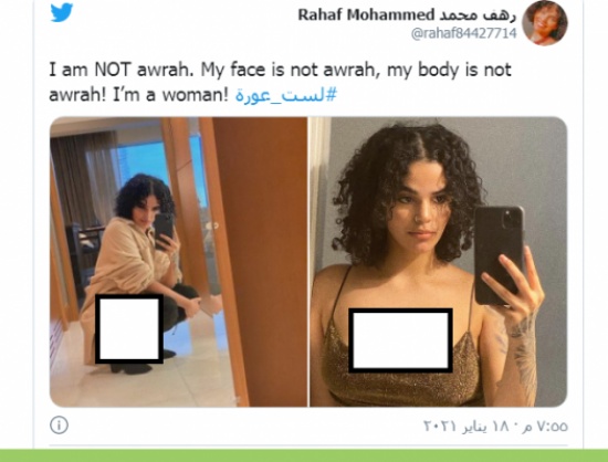 ونشرت صورة جريئة عبر حسابها في موقع “تويتر”، إذْ كشفت عن جزء من “مؤخرتها”، وأرفقت الصورة برسالة قالت فيها: “أنا لست عورة.. وجهي ليس عورة.. جسدي ليس عورة! أنا امرأة..”.