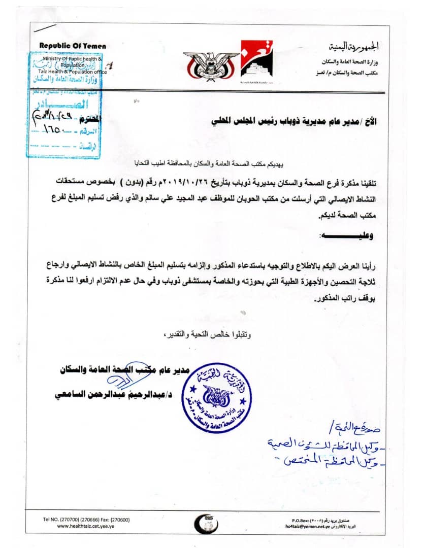 وبحسب الوثائق التي تبتت صحة الشيخ الحيقي عن تورط المدعو الشاعري، استحواذه على ميزانية تشغيلية لمكتب الصحة ذو باب من 2018 إلى عام 2020، الى جانب قيامه ببيبع العلاجات المخصصة لاهالي المديرية .