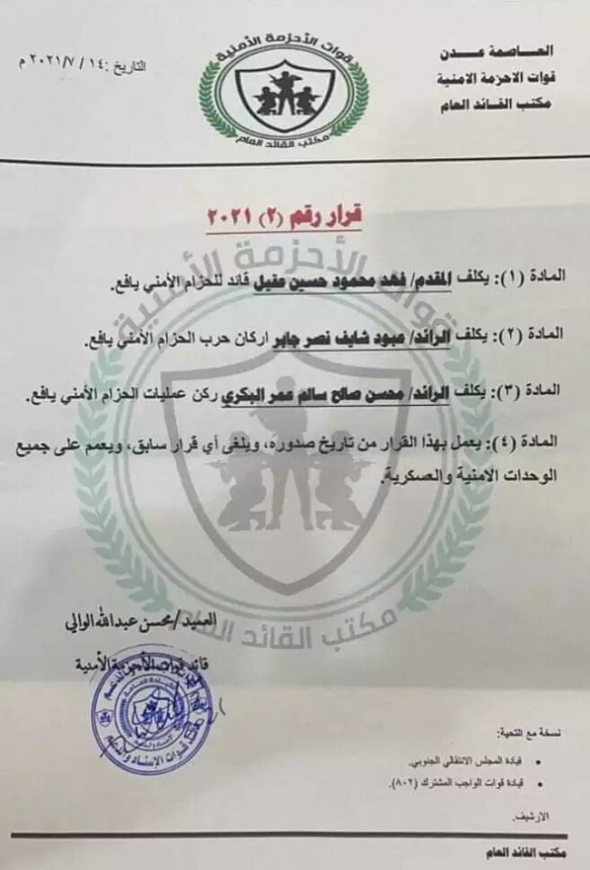 وقالت وسائل إعلام تابعة للمجلس الانتقالي أن من اسمته “القائد العام لقوات الاحزمة الأمنية” العميد محسن الوالي أصدر أمس الأربعاء قرارا بتكليف المقدم فهد محمود حسين عقيل المرفدي قائدا لقوات الحزام بيافع، والرائد عبود شايف نصر جابر أركان حرب لقوات الحزام، والرائد محسن صالح سالم عمر البكري ركن عمليات للقوات.