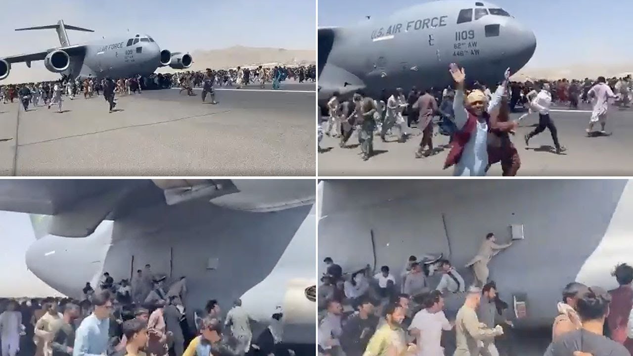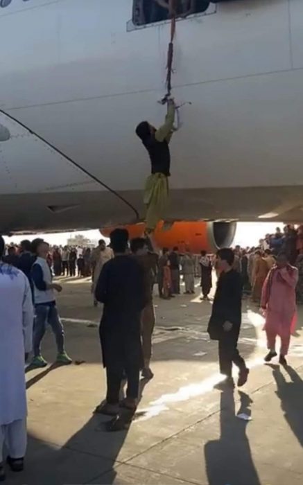 تشبث العشرات من الافغان العاملين مع القوات الامريكية طوال 20 عاما، بعجلات الطائرات الامريكية وبواباتها املا في مغادرة افغانستان، ووثقت الكاميرات مشاهد مآساوية لمصير عدد من المتشبثين بعد اقلاع الطائرة وتساقطهم من الجو إلى الارض قتلى.