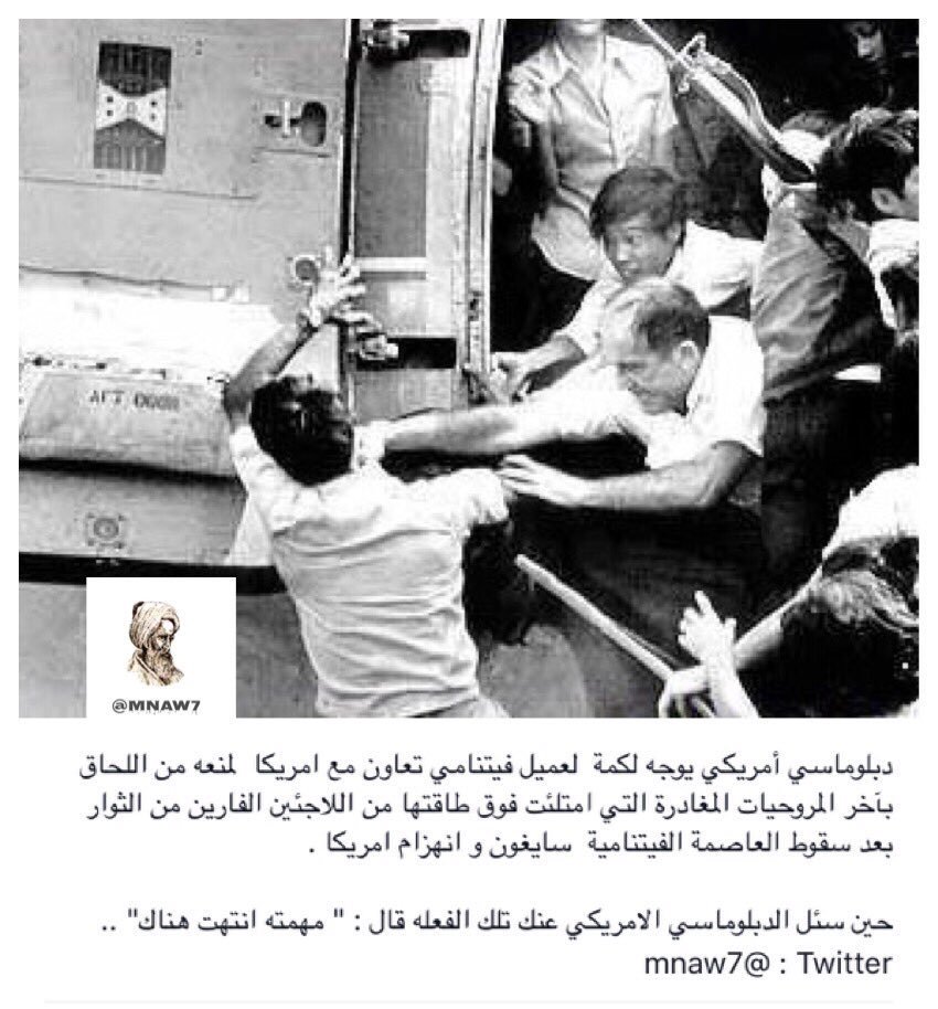 حدث هذا في فيتنام، عام 1973م، حسب ما تظهر صور وثقت عملية اجلاء الطائرات الامريكية قواتها وبعثتها الدبلوماسية وموظفيها وعائلاتهم من المواطنينالامريكيين، والتخلي عن آلاف العاملين في خدمة القوات الامريكية من يوصفون بالعملاء المحليين.