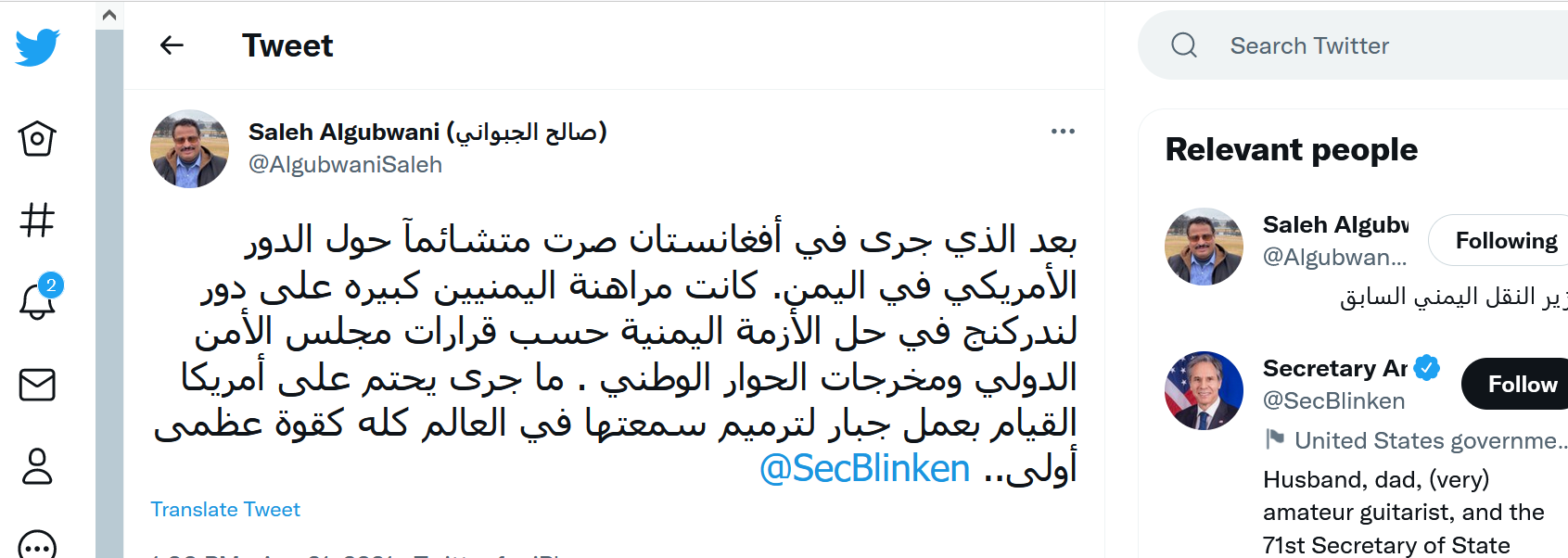 وقال الجبواني في تغريدة له على تويتر: "بعد الذي جرى في أفغانستان صرت متشائمآ حول الدور الأمريكي في اليمن. كانت مراهنة اليمنيين كبيره على دور لندركنج في حل الأزمة اليمنية حسب قرارات مجلس الأمن الدولي ومخرجات الحوار الوطني".