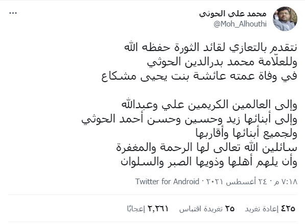 وقد أثارت تعزية القيادي الحوثي التي نشرها في تغريدة على حسابه بموقع التدوين المصغر “تويتر” ردوداً وتعليقات كثيرة من المتابعين حول اسم المرأة المتوفاة والقريبة من زعيم الحوثيين، المتهمون بالإساءة لزوجة النبي صلى الله عليه وسلم أم المؤمنين عائشة رضي الله عنها.