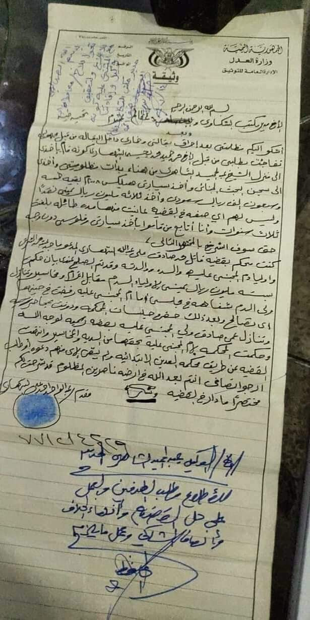 وفي تفاصيل الواقعة، قام المشرف الشهاري، بنهب سيارة من نوع هايلوكس تعود لمواطن من أبناء محافظة إب، ورفضت الجهات المختصة عدة شكاوي تقدم بها، وفقاً لوثائق حصل نافذة اليمن على نسخة منها.