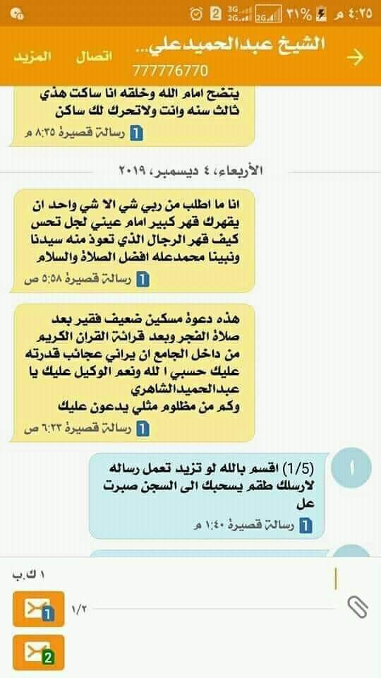 وأظهرت صورة مراسلة حصل نافذة اليمن على نسخة منها، شكا فيها المواطن الظلم والقهر الذي طاله من المشرف الشهاري الذي رد على رسائله بتهديد نصه: " اقسم بالله لو تزيد تعمل رساله لارسلك طقم يسحبك إلى السجن".