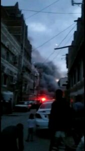وقال الناشطون أن حريق ضخم تسبب بإنفجار عنيف في إحدى محلات الألعاب النارية في صنعاء القديمة.