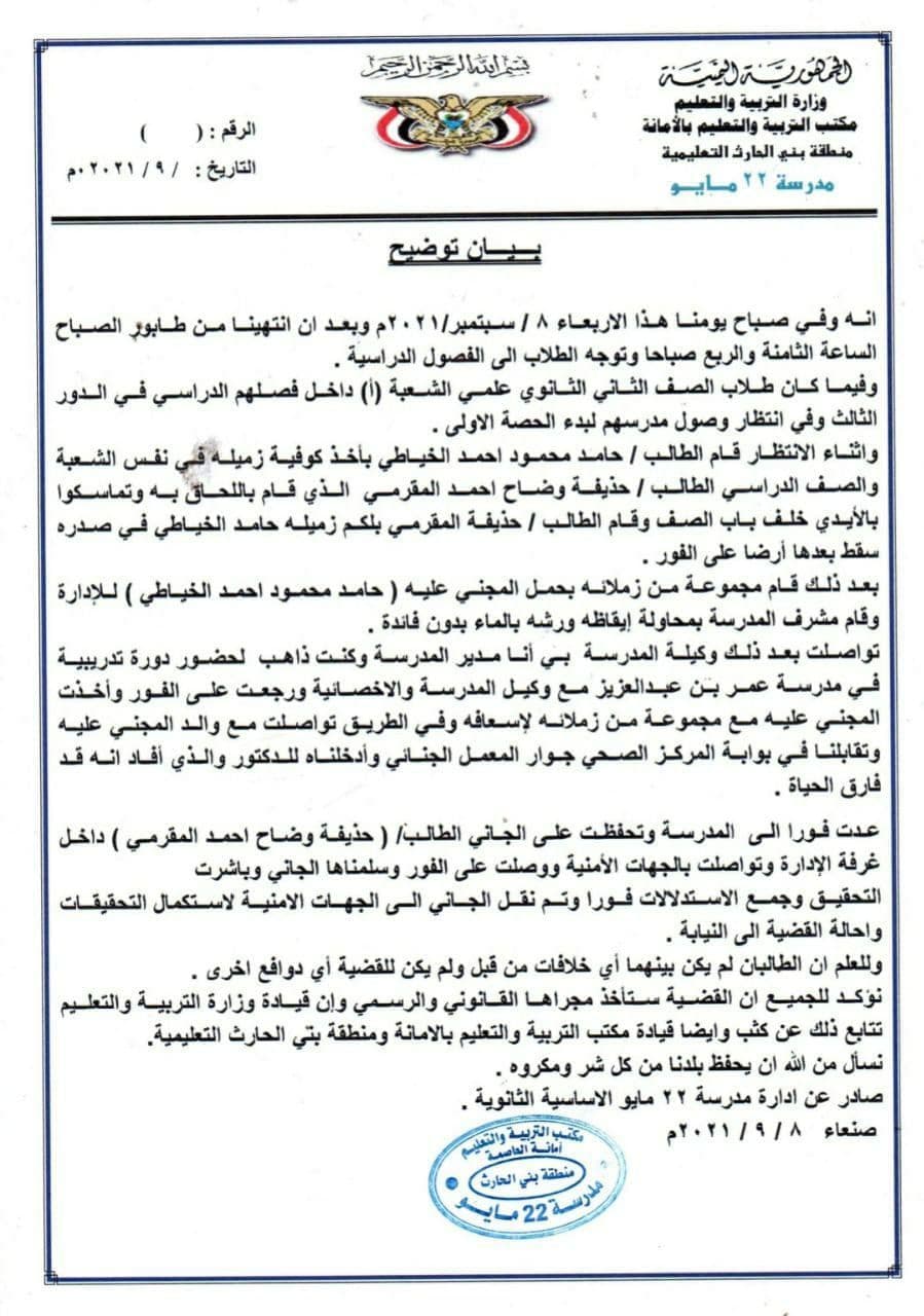 أصدرت إدارة مدرسة 22 مايو في العاصمة صنعاء، بيان، كشفت فيه تفاصيل الحادثة التي وقعت صباح اليوم بالمدرسة وراح ضحيتها الطالب حامد محمود الخياطي.