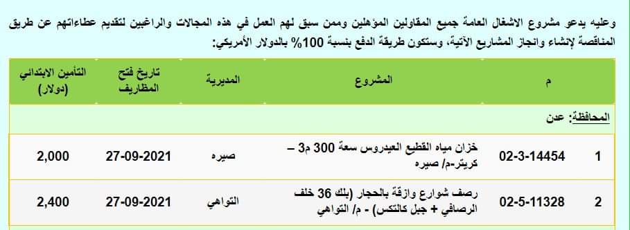 سيبدأ خلال الأيام القادمة مكتب مشروع الأشغال العامة في صنعاء تنفيذ عدد من المشاريع في محافظة عدن بينها مشروع رصف شوارع (خلف حي الرصافي + جبل كالتكس) - مديرية/ التواهي، بالإضافة إلى بناء خزان مياه لحي القطيع العيدروس سعة 300 م3 –كريتر-مديرية/ صيرة..