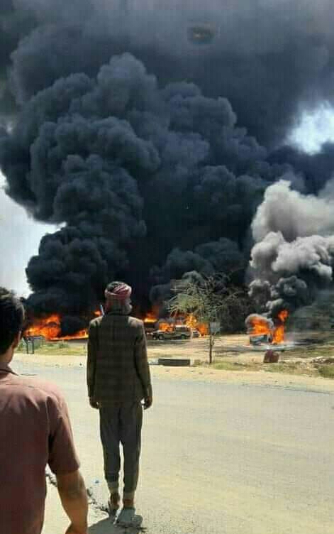 وقالت المصادر، إن أكثر من 20 شاحنة محملة بالمشتقات النفطية اشتعلت فيها النيران مساء اليوم، مما أدى إلى انفجارات ضخمة وتصاعد ألسنة اللهب في سماء مديرية ذي ناعم.