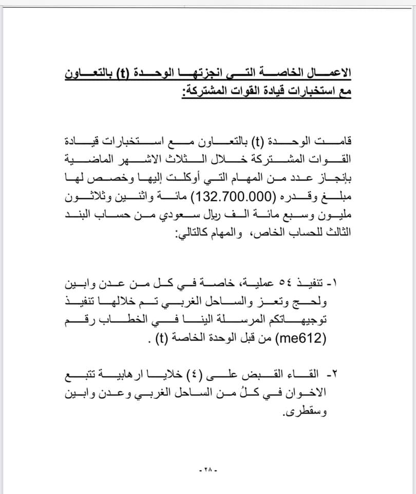 وحسب الوثائق التي سربها محرر الشؤون اليمنية في قناة الجزيرة أحمد الشلفي، فإن الإمارات شكلت وحدة خاصة للعمل الاستخباراتي والعسكري في اليمن أطلقت عليها “الوحدة T” مهمتها رفع تقارير دورية لمسؤولين رفيعين في نظام أبو ظبي.