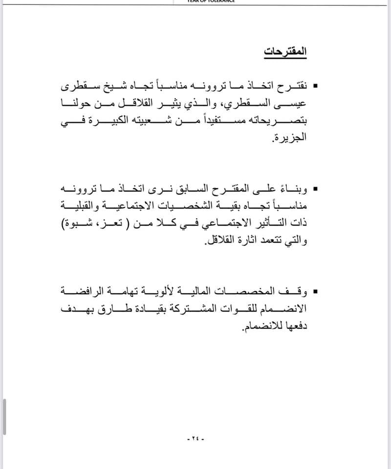 وأوضحت الوثائق، إن هناك خطط تم وضعها للتخلص من شخصيات مناوئة للإمارات منها شيخ مشايخ سقطرى المعارض للإمارات عيسى بن ياقوت، والتصرف مع بقية الشخصيات الاجتماعية في الأرخبيل، بالإضافة الى تعز والساحل الغربي (المقاومة التهامية المعارضة للإمارات).