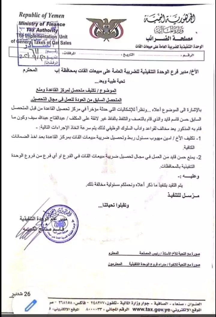 وجاء القرار عقب قيام أحد موظفي الضرائب في مديرية القاعدة بمحافظة إب ويدعي حسن قاسم قائد بالتهجم بألفاظ جارحة بحق بائع القات المعاق في أحد أسواق مدينة القاعدة قبل أيام .