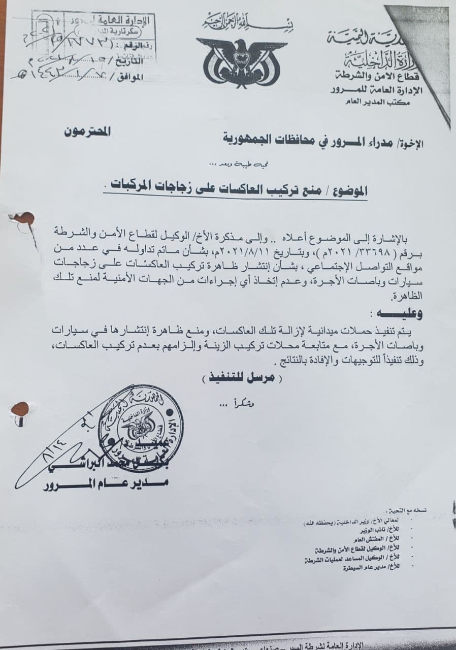 وعممت الإدارة العامة للمرور في مناطق سيطرة الحوثيين تعميماً لجميع فروعها في العاصمة صنعاء وبقية المحافظات الواقعة تحت سلطتها بتنفيذ حملة ميدانية لإزالة العواكس المركبة في زجاجات سيارات وباصات الأجرة.