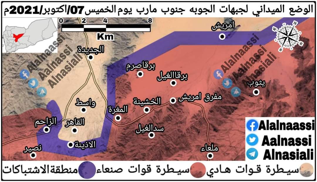 وكان اليمن السعيد ، قد نشر فجر الخميس ، خريطة توضح الوضع الميداني لطرفي الصراع في جبهات مديرية الجوبة جنوبي محافظة مأرب وأماكن الإشتباكات ، فيما شن الحوثيون هجوماً بصاروخ باليستي تسبب بانفجار عنيف في معسكر صحن الجن ، وفق ماافادت مصادر محلية ، عصر اليوم .