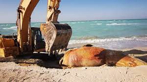 طويل الحجم .. حوت نافق يجنح على شاطئ شرق السعودية وهكذا تم التعامل معه(صورة)
