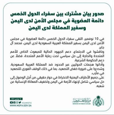 صدر اليوم بيان مشترك تناقلته وكالات الأنباء عقب اللقاء الذي جرى بين سفراء الدول الخمس دائمة العضوية في مجلس الأمن بخصوص اليمن، وسفير المملكة لدى اليمن فيما يلي نصه: