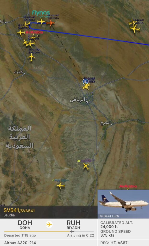 ويظهر من خلال صورة بيانات الرادار توقف الحركة الجوية في مطار الرياض وأن عددا من الطائرات عالقة في الأجواء.