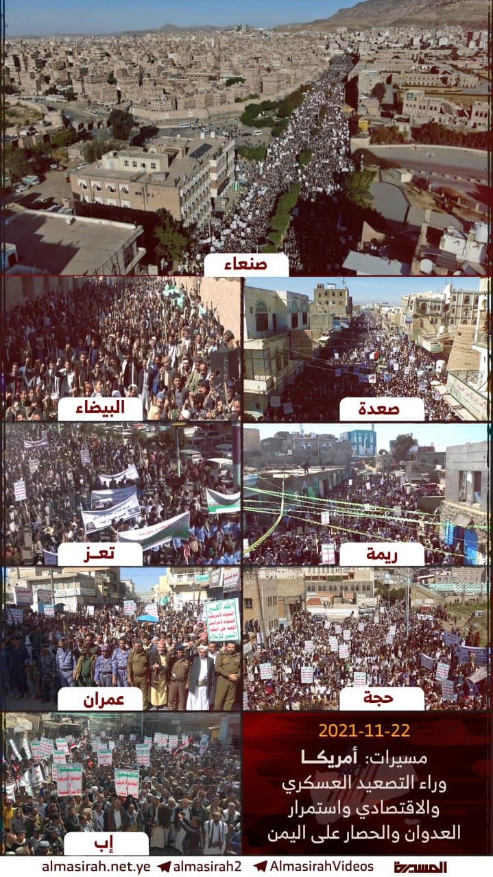 في السياق، شهدت العاصمة صنعاء ونحو 14 محافظة تخضع لسيطرة جماعة الحوثي، مسيرات شعبية تدين الولايات المتحدة الامريكية بقتل اليمنيين وقيادة العدوان (عمليات التحالف والجيش الوطني). مشيرة في بياناتها إلى أن "الحرب اعلنت من واشنطن وبسلاح امريكي وغطاء سياسي امريكي".