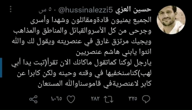 وقال القيادي الحوثي البارز حسين العزي والذي يعمل على نشر التشيع الإثني عشري في اليمن إن جماعته وأسرته لو كانت عنصرية كانت ستحذف سورة المسد من القرآن ولن يعلم أحد بمصير السورة التي تبدأ بتبت يدا ابي لهب.