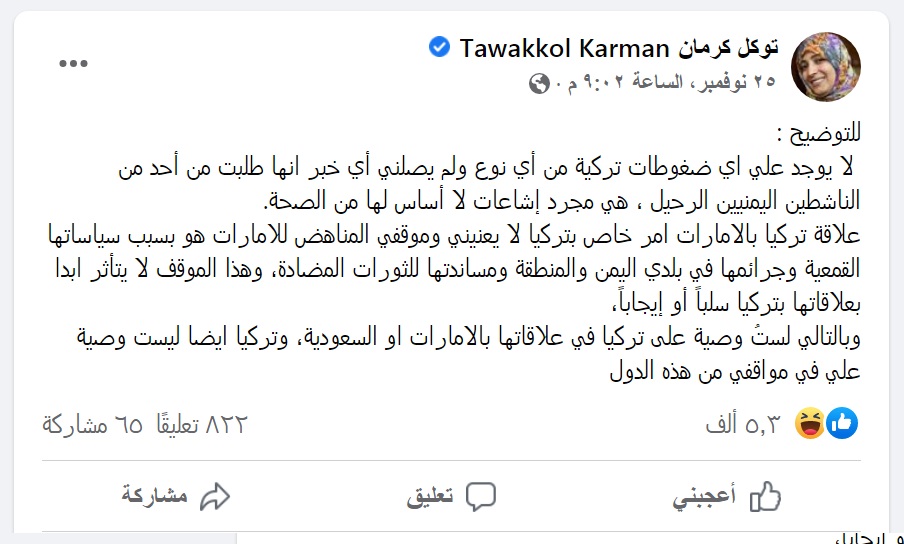 وتابعت الناشطة اليمنية الحائزة على جائزة نوبل للسلام توكل كرمان: "وبالتالي لستُ وصية على تركيا في علاقاتها بالامارات او السعودية، وتركيا ايضا ليست وصية علي في مواقفي من هذه الدول".