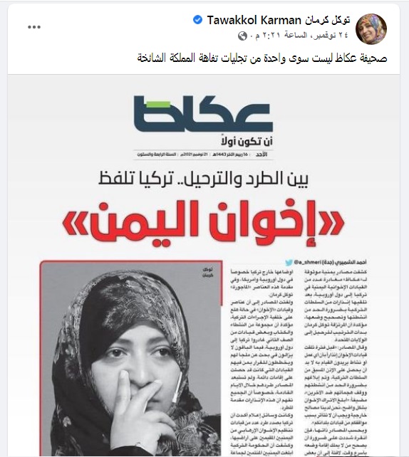 أرفقت الصحيفة السعودية المحسوبة على النظام، خبرها بصورة للناشطة اليمنية، في إشارة إلى أنها مستهدفة بالطرد. وبدورها ردت كرمان بقولها: ”صحيفة عكاظ ليست سوى واحدة من تجليات تفاهة المملكة الشائخة.”