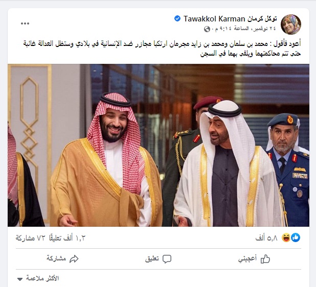لكنها أكدت على محاسبة ابوظبي والرياض، بقولها: "أعود فأقول محمد بن سلمان ومحمد بن زايد مجرمان ارتكبا مجازر ضد الإنسانية في بلادي وستظل العدالة غائبة حتى تتم محاكمتهما ويلقى بهما في السجن".