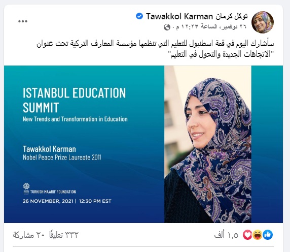 معلنة في تدوينة وتغريدة اخرى، على حسابيها بموقعي "فيس بوك" و"تويتر" ليل الجمعة، إنها: "سأشارك اليوم في قمة اسطنبول للتعليم التي تنظمها مؤسسة المعارف التركية تحت عنوان "الاتجاهات الجديدة والتحول في التعليم".