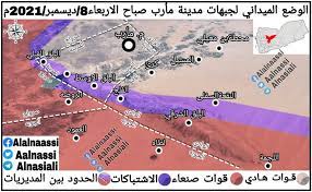 تداول ناشطون يمنيون على مواقع التواصل الاجتماعي خارطة عسكرية جديدة توضِّحُ الوضعَ الميداني في جبهات الوادي ومدينة مأرب مساء الأربعاء 08/ ديسمبر/ 2021م.